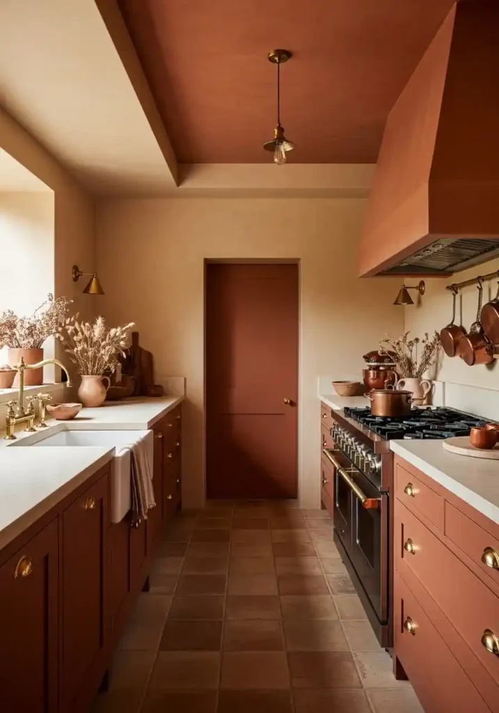 The specific warm color story that creates the most cozy and the most organically beautiful kitchen envelope is the terracotta and ochre family — the specific range of warm, slightly orange-earthy tones drawn from the world of fired clay, Mediterranean plasterwork, and ancient pigment traditions that feels simultaneously the most ancient and the most genuinely warm of all domestic color palettes. Terracotta on the cabinets, warm ochre limewash on the walls, a slightly deeper terracotta on the ceiling, and terracotta floor tiles create a color story of such complete, continuous, enveloping warmth that the cream limestone countertop — the single light surface in the entire warm envelope — appears more luminous, more brilliantly cream, and more beautifully resolved by the warm surroundings than it would in any neutral kitchen context.
