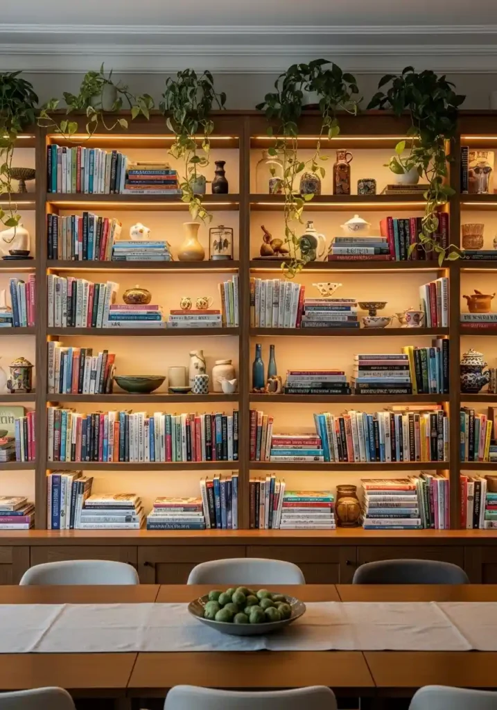 The most beautiful dining room bookshelf styling combines beautiful cookbooks as the primary display material with ceramic objects, small plants, and personal treasures distributed throughout to create a warmly curated composition of genuine personal character! Position the most beautiful and most visually spectacular cookbook spines at eye level where they create maximum impact and most easily tempt diners to reach for them between courses. Trailing plants cascading from upper shelves add living organic beauty that makes the bookshelf feel alive and dynamically beautiful. Warm LED lighting on each shelf level transforms the bookshelf into a beautifully lit display of genuine domestic cultural richness.