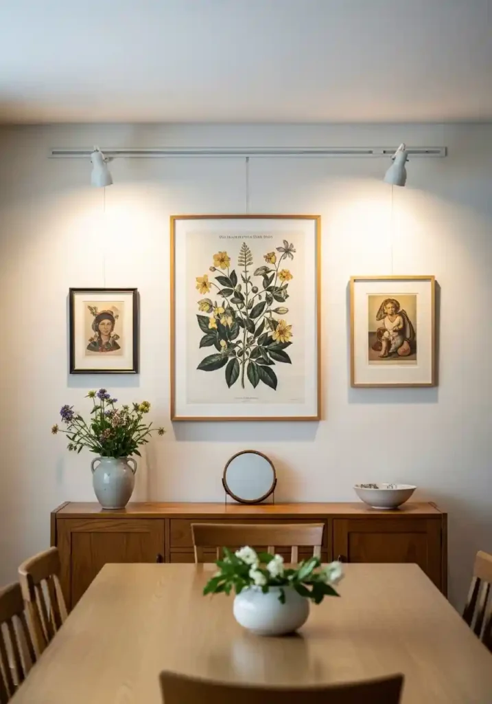 The most beautiful dining room art selections are those chosen for genuine personal meaning and authentic aesthetic passion rather than decorative compatibility — a large botanical print that references your love of gardens, a landscape that connects to a meaningful place in your personal history, an abstract work in colors that resonate with the room’s palette while possessing independent artistic merit, or a collection of food and culinary artworks that celebrate the very activity taking place at the table beneath them with warmth, humor, and genuine thematic appropriateness! Frame simply in natural wood or black for maximum elegance.