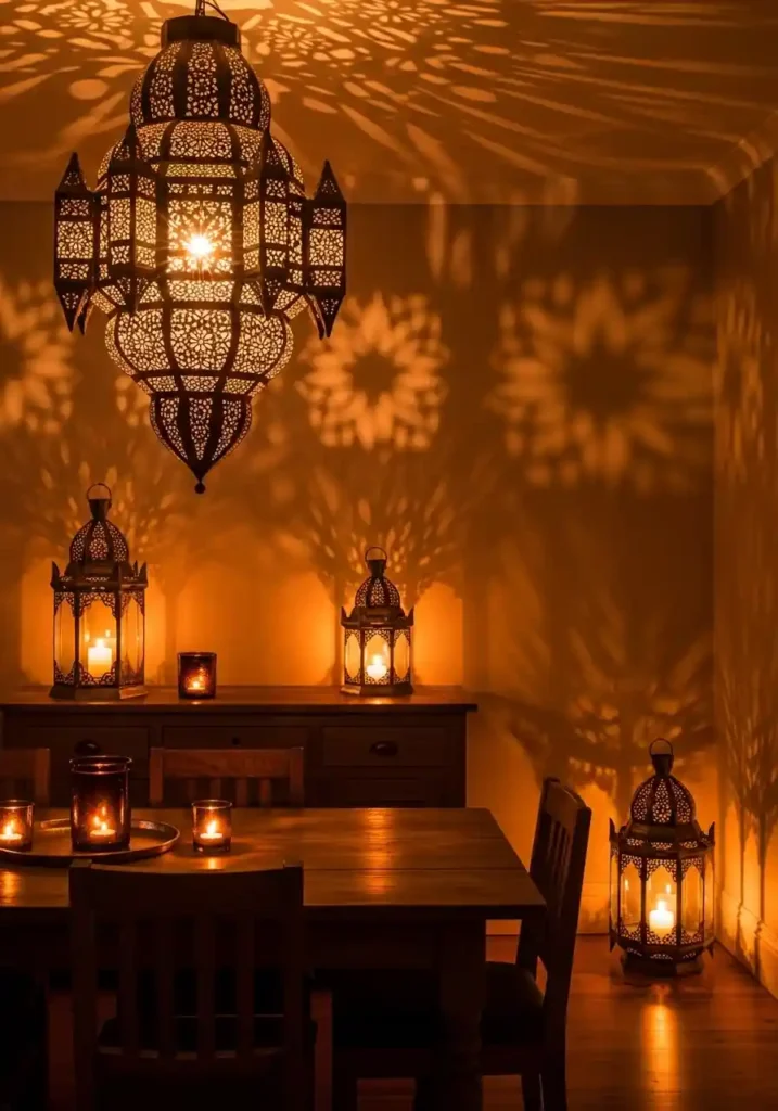 Moroccan lanterns in a dining room create the most extraordinarily atmospheric and most genuinely transportive dining environment available — the intricate metalwork casting the most beautiful star and geometric light patterns across the ceiling, walls, and table in a continuously shifting display of warm shadow and amber glow that makes every dinner feel like an event of genuine magic and extraordinary sensory beauty! Moroccan lanterns transform any dining room from simply decorated to genuinely, magnificently atmospheric with a speed and completeness that few other single decor elements can approach.