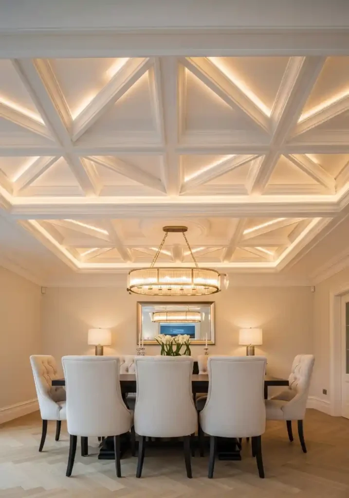 A coffered ceiling with integrated LED lighting creates the most classically magnificent and most atmospherically beautiful ceiling treatment available at any level of residential investment — the deeply articulated grid of recessed panels creating extraordinary three-dimensional visual richness overhead while the integrated warm LED strips within each coffer create the most beautifully layered and most atmospherically sophisticated ceiling illumination available! A LED cove at the perimeter of a tray ceiling creates a floating ceiling effect of genuine contemporary elegance. Decorative plaster molding cornice creates the most classically beautiful ceiling-to-wall transition of genuine architectural richness.