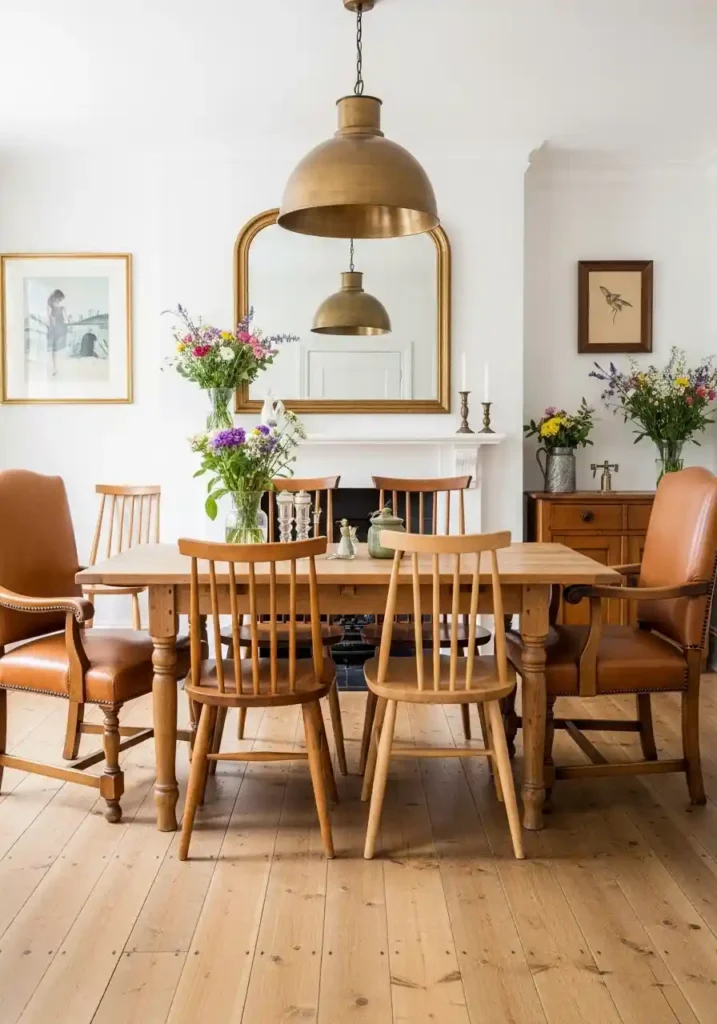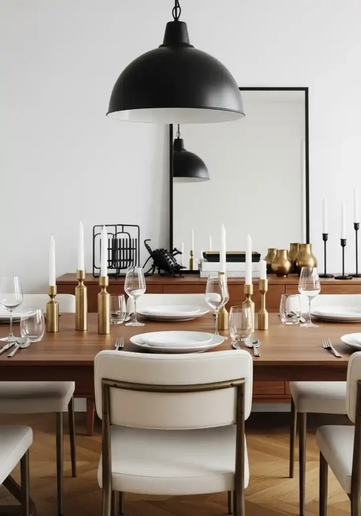 Mixed metals in a stylish dining room — when executed with genuine intentionality and a clear understanding of which metals work most harmoniously together — create a far more sophisticated and more genuinely interesting design composition than a single-metal palette can achieve, because the layering of warm brass, matte black, and occasional antique bronze creates a material richness of genuine depth and genuine eclecticism that communicates design confidence and aesthetic intelligence rather than the playing-it-safe uniformity that matching all metals in a single finish always produces!