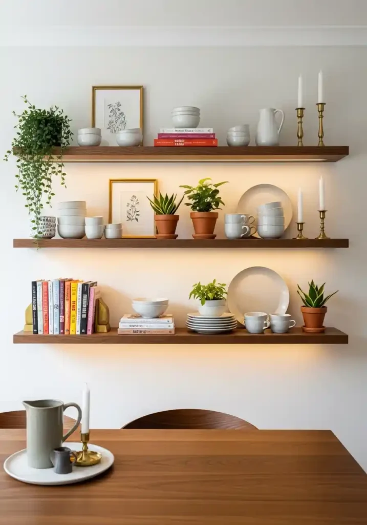 The styling of floating dining room shelves requires the most thoughtful attention to visual balance and compositional variety to achieve the curated, intentional quality that makes this approach so impressively and consistently beautiful! Vary the distribution of objects, books, and empty space across each shelf for a rhythm of fullness and breathing room that feels genuinely collected rather than simply crammed with objects assembled without aesthetic thought. Install warm LED strip lighting on the underside of each shelf to illuminate the display and create a beautiful, warm glow that makes the shelf styling look dramatically more professional and more intentional at every hour of the day.