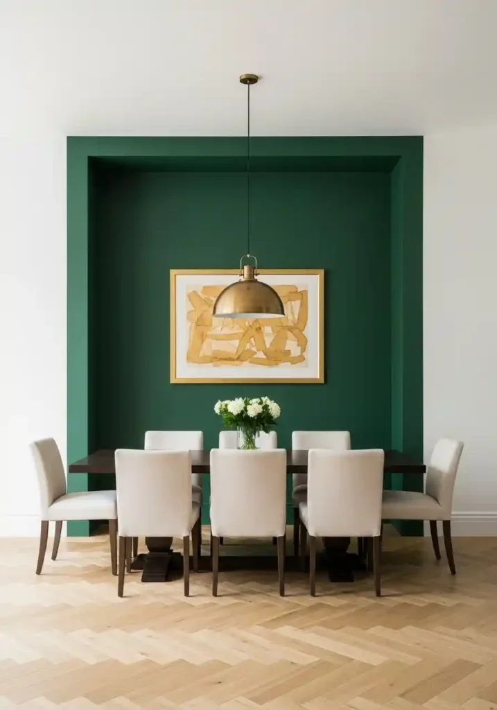 A jewel-toned accent wall behind the dining table is the most immediately impactful and most dramatically transformative single decor decision available — painting just one wall in a deeply saturated, rich color while keeping the remaining walls light and neutral creates a dining room of extraordinary visual depth, genuine design confidence, and the kind of sophisticated color statement that makes every person who enters the room stop and genuinely admire the boldness and beauty of the choice! Dark colors on a single wall appear to recede, creating a beautiful sense of depth.