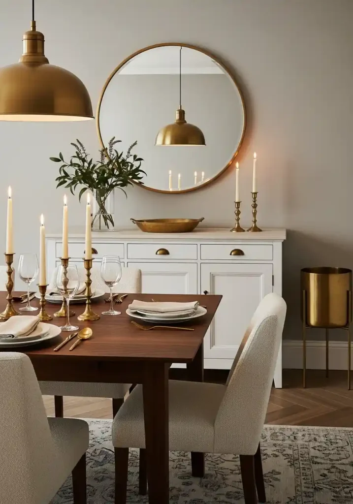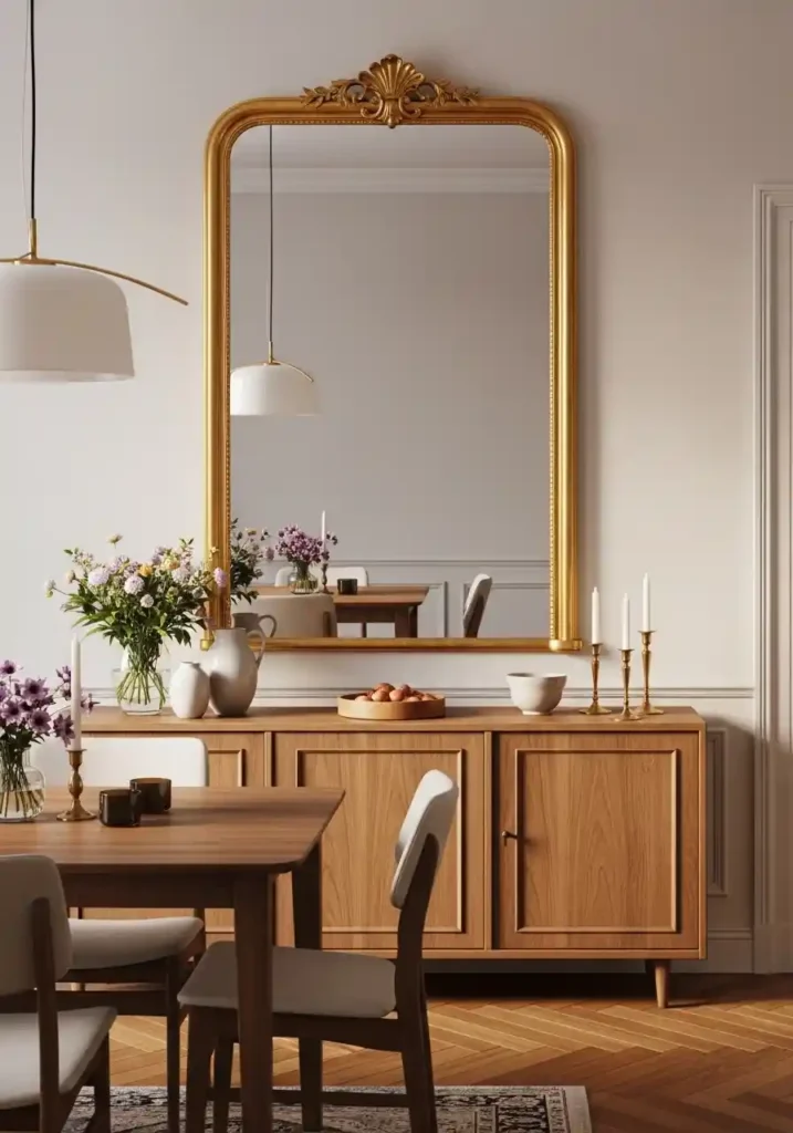 A large, beautifully framed mirror above the dining room sideboard is the most light-enhancing and most spatially generous decor element available — doubling the perceived size of the room by reflecting the dining table, pendant light, and the most beautiful window view simultaneously in a warm, beautiful reflection that fills the dining room with doubled natural light and doubled visual richness from the moment the morning sun enters until the last warm candle is extinguished at the end of the most beautiful evening dinner! Mirrors make dining rooms feel generous even when they are genuinely compact.