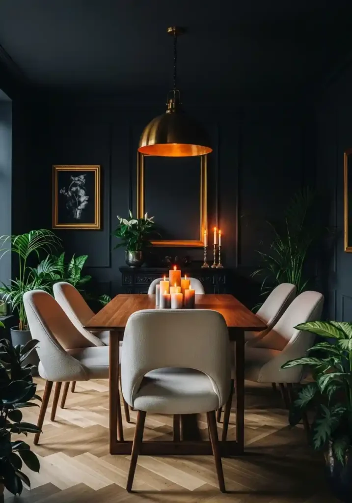 The warm metallic accents and bright contrasting elements that prevent a dark dining room from feeling oppressive are absolutely essential to the success of the moody dark aesthetic — warm brass or gold pendant light, cream or white chair upholstery, warm wood table surface, and abundant candlelight all creating pools and points of warm luminosity against the dark walls that make every element within the space appear more precious and more intentional! Lush tropical plants add vivid green that creates the most beautiful and most vividly alive contrast against deep charcoal or navy walls. The moody dining room is dramatically beautiful precisely because of its deliberate, confident darkness.