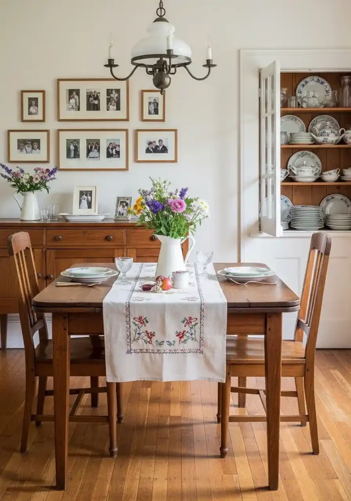 A dining room decorated with deeply personal heirloom objects — inherited furniture with genuine family history, cherished vintage china passed down through generations, meaningful photographs of actual family members, hand-embroidered textiles made by beloved relatives, and objects with specific personal stories of real emotional significance — achieves the most warmly human and most completely irreplaceable quality of beauty available in any dining space at any level of design investment or decorative sophistication! The most beautiful dining rooms are ultimately the ones where the most genuine, most personal, and most completely real stories are told through every lovingly chosen object.