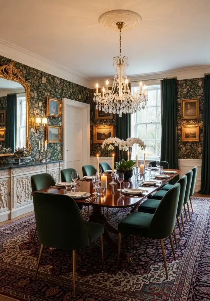 A maximalist pattern dining room is the elegant design approach that most completely, most joyfully, and most confidently rejects the tyranny of restraint in dining room design in favor of the bold, the richly patterned, the deliberately complex, and the genuinely, unapologetically beautiful — because a dining room designed with the courage to commit fully to a grand floral wallpaper, richly upholstered jewel-tone chairs, a crystal chandelier, and a Persian rug simultaneously creates an atmosphere of such extraordinary visual richness and such complete, concentrated design confidence that it makes every more restrained dining room alternative appear comparatively impoverished by the comparison.