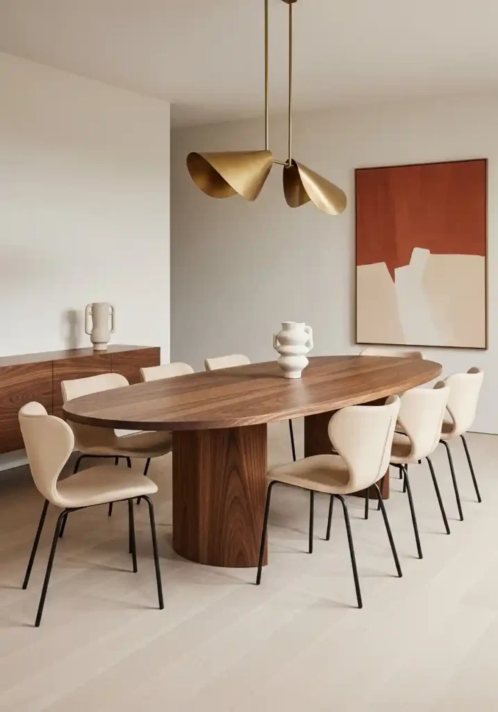 The bookmatched walnut dining table is the sculptural furniture dining room’s most magnificent and most completely resolved design element — because a single slab of bookmatched walnut, with its mirror-imaged grain pattern creating a perfectly symmetrical natural composition across the full table surface, is simultaneously the most practically excellent and the most artistically extraordinary dining table available, functioning as a permanent work of natural wood art that makes every meal served upon it feel like a gathering around something genuinely, completely beautiful. The walnut’s rich, warm brown tones against the cream chairs and the warm white walls creates a material composition of extraordinary natural sophistication.