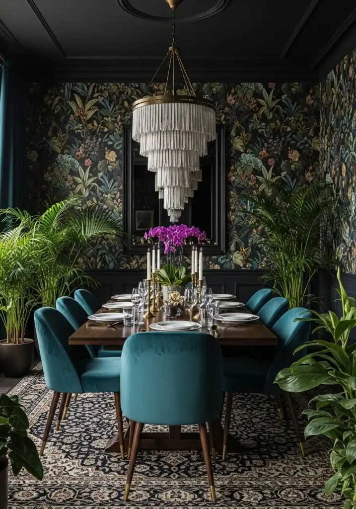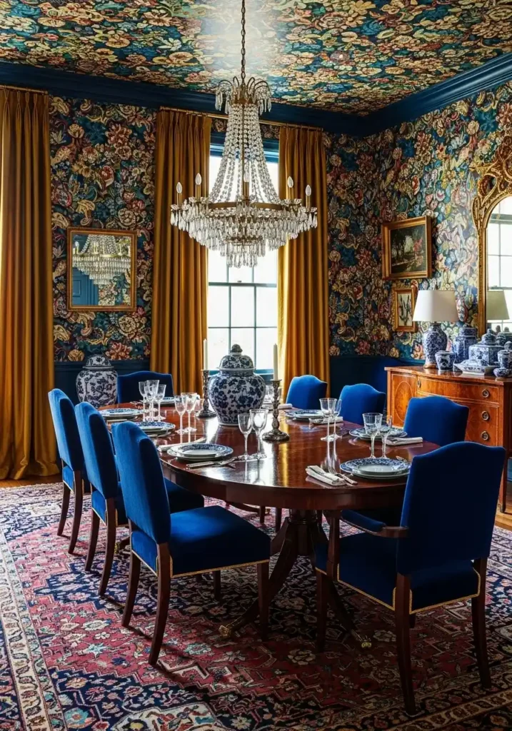 The grand floral wallpaper covering all four walls of the maximalist dining room is the design commitment that creates the most completely immersive and the most genuinely theatrical dining environment available — because wallpaper that covers every wall of a room creates a quality of total, three-dimensional immersion in the pattern that is completely different from and completely superior to the same pattern on a single feature wall. The diner surrounded on all four sides by a grand, beautifully drawn floral wallpaper feels genuinely enclosed within the pattern, genuinely immersed in its color and its botanical richness, in a way that makes every meal within it feel like dining inside a magnificent, private garden room.