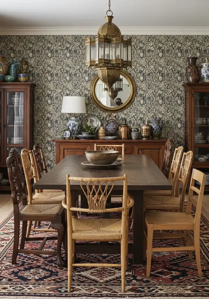 The deliberately mismatched collection of dining chairs — each from a different global design tradition but all sharing the same broad family of natural materials, warm tones, and handmade craft character — is the eclectic global dining room’s most distinctive and most completely individual design statement, because it creates a dining gathering that looks like the chairs have been collected one by one over years of travel and aesthetic engagement with the world’s craft traditions rather than selected from a catalog as a matched set. The mismatched global chair collection communicates genuine design knowledge and genuine personal curiosity about the world’s beautiful domestic object traditions.