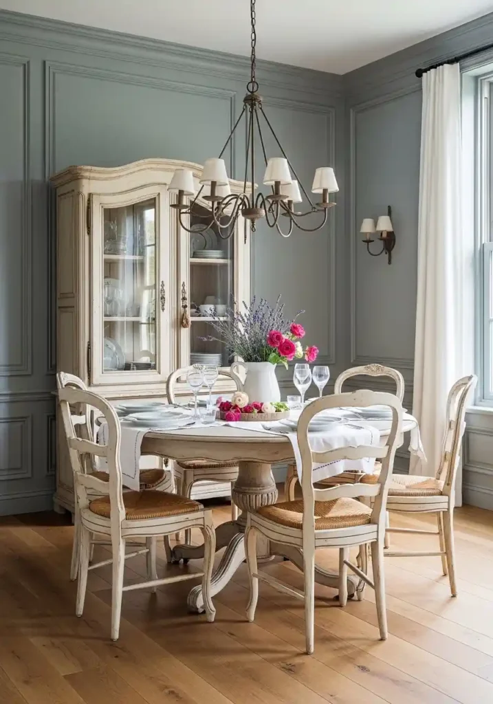 The round pedestal dining table is the French Provincial dining room’s most socially generous and most spatially elegant furniture choice — because the round table creates a gathering of complete democratic equality where every diner is equally central and equally part of every conversation, while the central pedestal base eliminates the table legs that create obstacles and discomfort for seated diners around a conventional four-legged table. A cream-painted round pedestal table with a slightly distressed finish in a room of French boiserie paneling and honey oak floors creates a dining environment of such warm, classical, genuinely French domestic beauty that every meal served within it feels quietly, completely civilized.