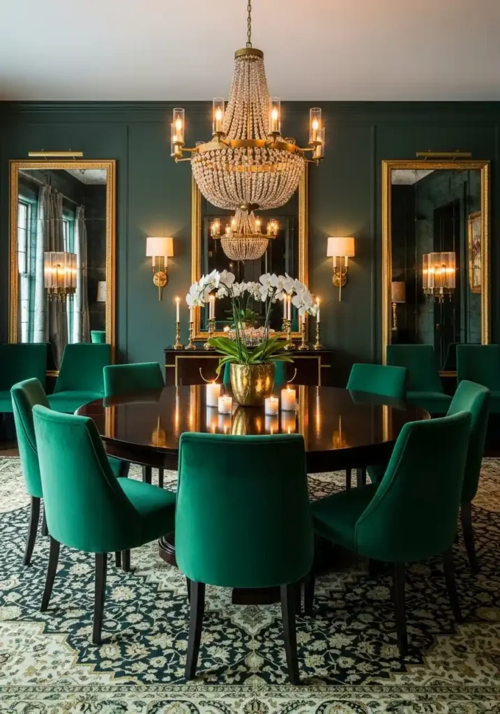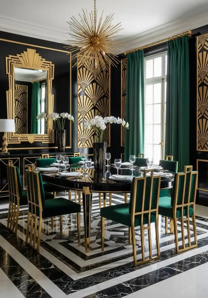 The deep emerald green velvet dining chairs against the black lacquer walls and the gold geometric paneling create the most spectacular jewel-tone accent in the Art Deco dining room — because emerald green’s deep, saturated richness creates a color of such concentrated, velvet-enhanced beauty against the surrounding gold and black that the chairs appear to glow with their own internal color energy, making every person seated in them appear more beautifully dressed, more warmly lit, and more genuinely glamorous than they would in the same clothes in any other room. The emerald velvet chairs are the Art Deco dining room’s most brilliantly beautiful human-scale design detail.