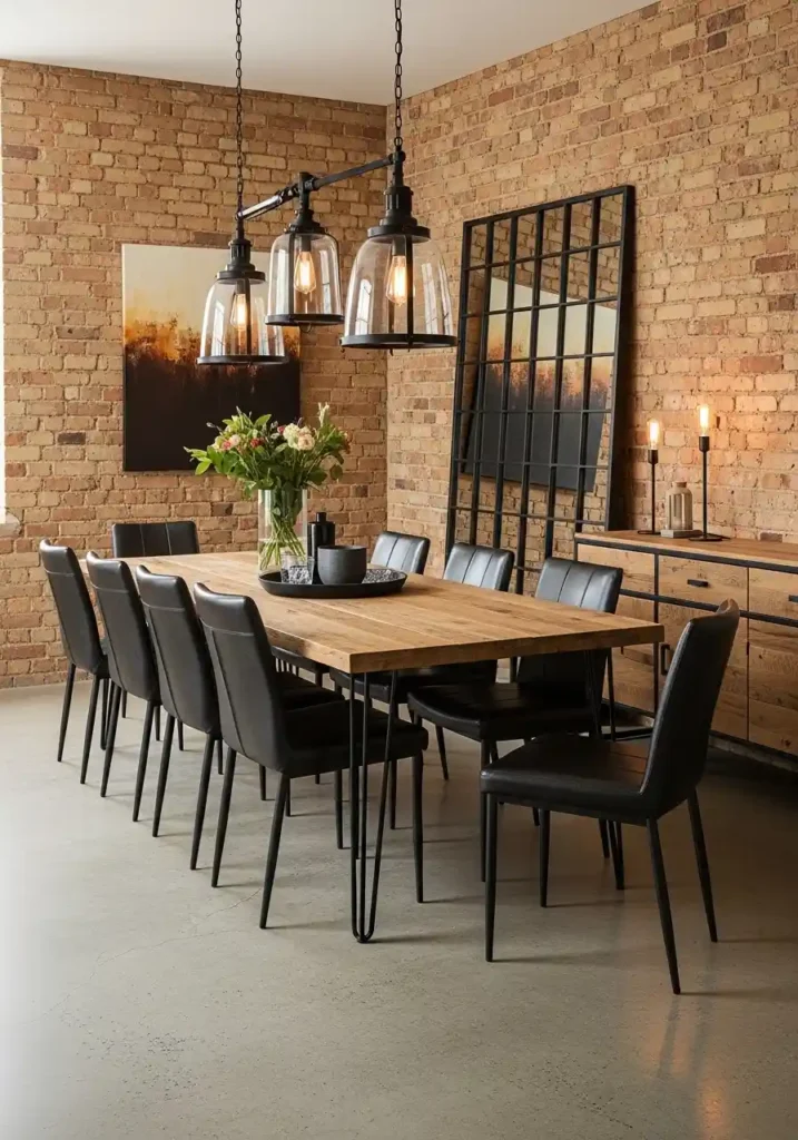 The combination of exposed brick wall and reclaimed oak dining table in an industrial chic dining room creates the most complete and the most beautifully resolved material contrast in the industrial dining design vocabulary — because the brick’s warm, slightly irregular, genuinely aged ochre and russet tones and the reclaimed oak’s rich, warm brown with its visible previous-life history of nail holes and weathering create a material dialogue of two genuinely honest, genuinely aged materials in such natural, warm, organic harmony that the industrial dining room achieves a quality of genuine material richness and genuine historical depth that the most expensively specified conventional dining room cannot replicate with manufactured materials.
