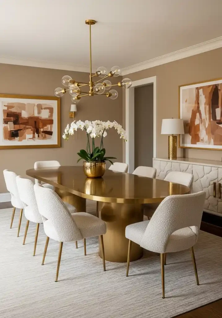 The warm gold brass of the oval dining table is the single material departure from the cashmere neutral palette that creates the most spectacular and the most brilliantly resolved accent — because warm brushed gold against cashmere creates a material relationship of such complete, naturally harmonious warmth that the gold appears to be drawn from within the cashmere’s own warmth rather than introduced as a contrasting accent. The gold table base and the gold chair legs and the gold chandelier create a warm metallic thread running through the cashmere interior that makes the entire dining room appear to glow from within with its own warm, golden, deeply luxurious light.