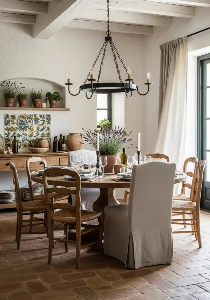 The rough whitewashed plaster walls with their organic texture and their characteristic tonal variation — slightly darker in the recesses, slightly lighter on the raised surfaces, creating a wall of perpetually changing, light-driven natural beauty — are the architectural material that most completely and most authentically establishes the Mediterranean dining room’s fundamental character of ancient, organic, genuinely beautiful domestic architecture. Whitewashed plaster walls have been creating beautiful Mediterranean domestic spaces for millennia, and their presence in a contemporary dining room creates an immediate, completely convincing connection to that vast, ancient tradition of beautiful Mediterranean domestic life.