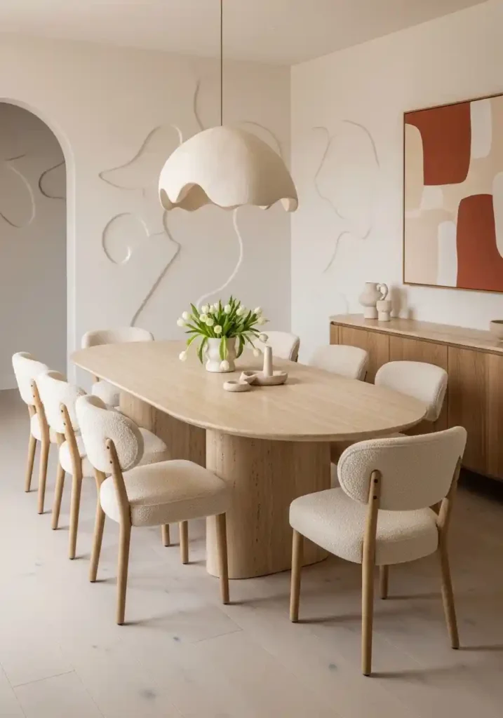 The oval travertine dining table is the organic modern dining room’s most magnificent and most architecturally powerful centerpiece — because travertine’s warm cream and honey tones with its characteristic natural voids and geological variation create a table surface of such genuine, living geological beauty and such completely organic material richness that it functions simultaneously as the room’s primary working surface and its most extraordinary permanent work of natural art. The gentle oval form, without corners or angular edges, creates a dining composition of such complete, warm, biomorphic beauty that every person seated around it feels naturally, completely at ease.