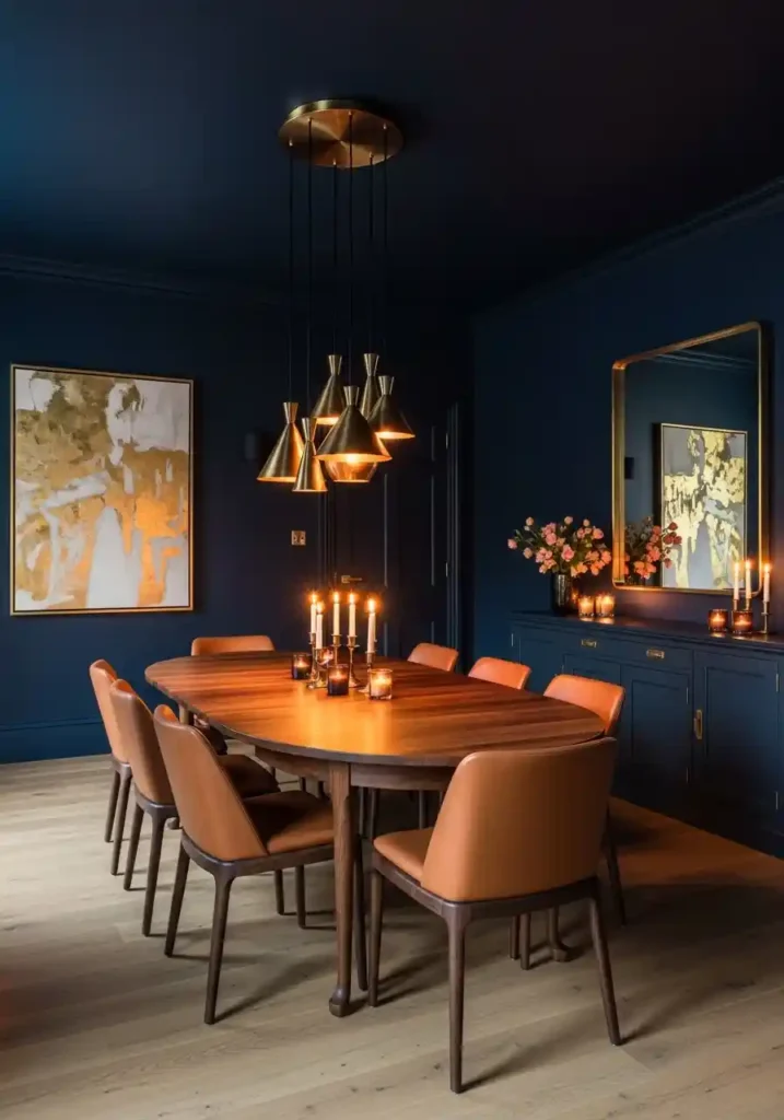 A moody dark dining room in deep midnight navy is the elegant dining design that creates the most atmospherically extraordinary and the most completely immersive dining experience available in residential design — because a room where the walls, the ceiling, and the architectural envelope are all in a single, deeply saturated navy blue creates a dining environment of such concentrated, warm, intimate atmospheric darkness that the warm amber light of pendant lights and candleflame appears almost luminous against the dark surfaces, creating a quality of concentrated, focused warmth around the dining table that makes every dinner party feel genuinely theatrical, genuinely glamorous, and genuinely unforgettable.