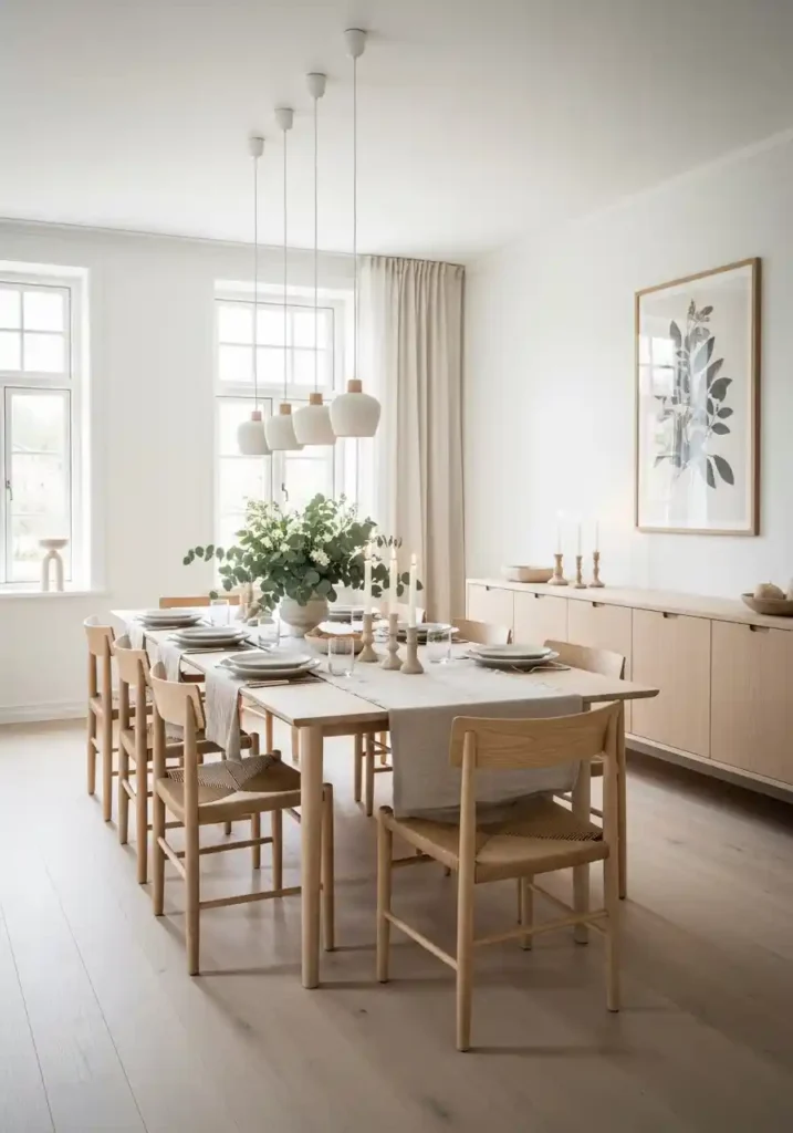 The pale birch dining table and chairs create the specific Scandinavian dining room material quality that is most completely irreplaceable by any other wood species or any other material — because birch’s very pale, almost white tone with its fine, subtle grain creates a dining table surface of such complete visual calm and such gentle, warm luminosity that it appears to generate its own soft natural light rather than simply to reflect the light from the windows and pendants above. The pale birch table in a white Scandinavian dining room creates a space of such extraordinary, sustained, daily-renewed freshness that it never looks dated and never looks anything other than completely, beautifully right.