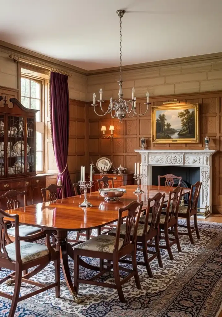 The oak wood paneling on the lower half of the traditional English dining room walls is the architectural material that most powerfully and most authentically establishes the room’s heritage character — because wood-paneled lower walls are among the most distinctive and the most historically significant features of traditional English domestic architecture, appearing in the most beautiful country houses and the most celebrated historic interiors of England from the Tudor period to the present day with complete historical continuity and complete, sustained architectural authority. The paneling’s warmth, its material depth, and its quality of genuine craftsmanship create a dining room of such complete architectural maturity that it feels genuinely, irrevocably historical.