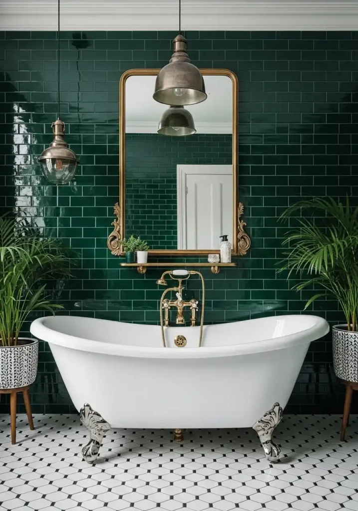 The secret to making emerald green work magnificently in a bathroom rather than feeling overwhelming or oppressive is understanding the critical importance of the right companion materials and the balance between the bold color and breathing space. A white freestanding clawfoot bathtub against emerald green tiled walls creates the most Pinterest-perfect contrast imaginable — the crisp white porcelain looking more luminously beautiful against the jewel-toned green than it ever could against any neutral backdrop. Polished brass fixtures add warm metallic richness that elevates the jewel-toned atmosphere to genuine luxury. Lush tropical plants echo the green in a softer, more organic register that makes the whole composition feel magnificently alive.