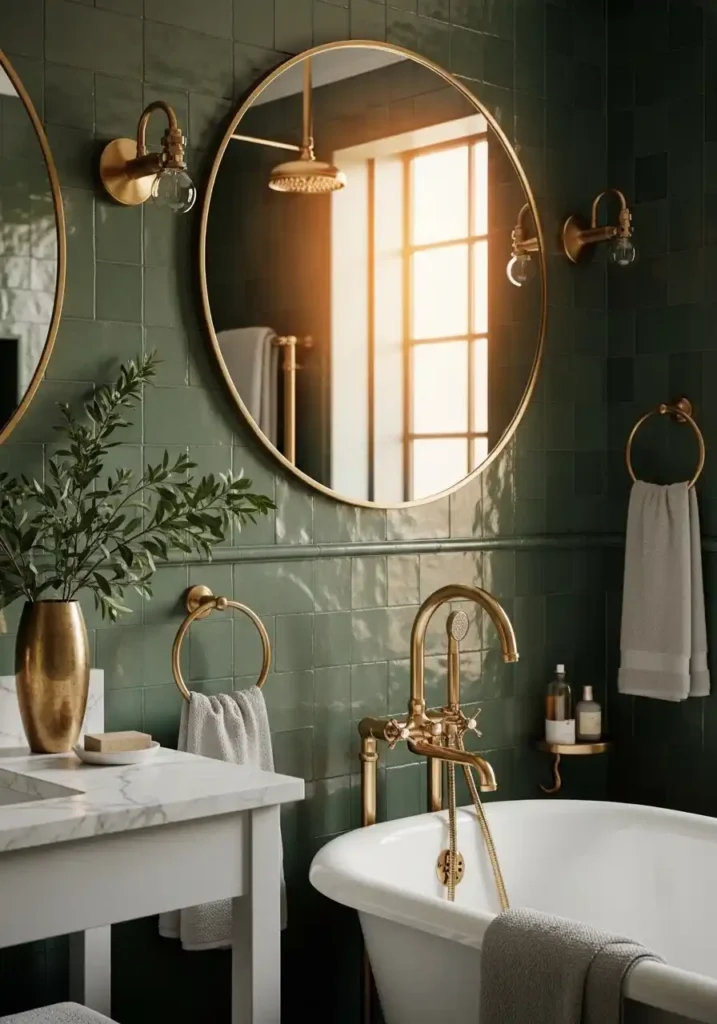 16. Green Bathroom With Brass Fixtures: The Warm Metallic Combination That Always Wins