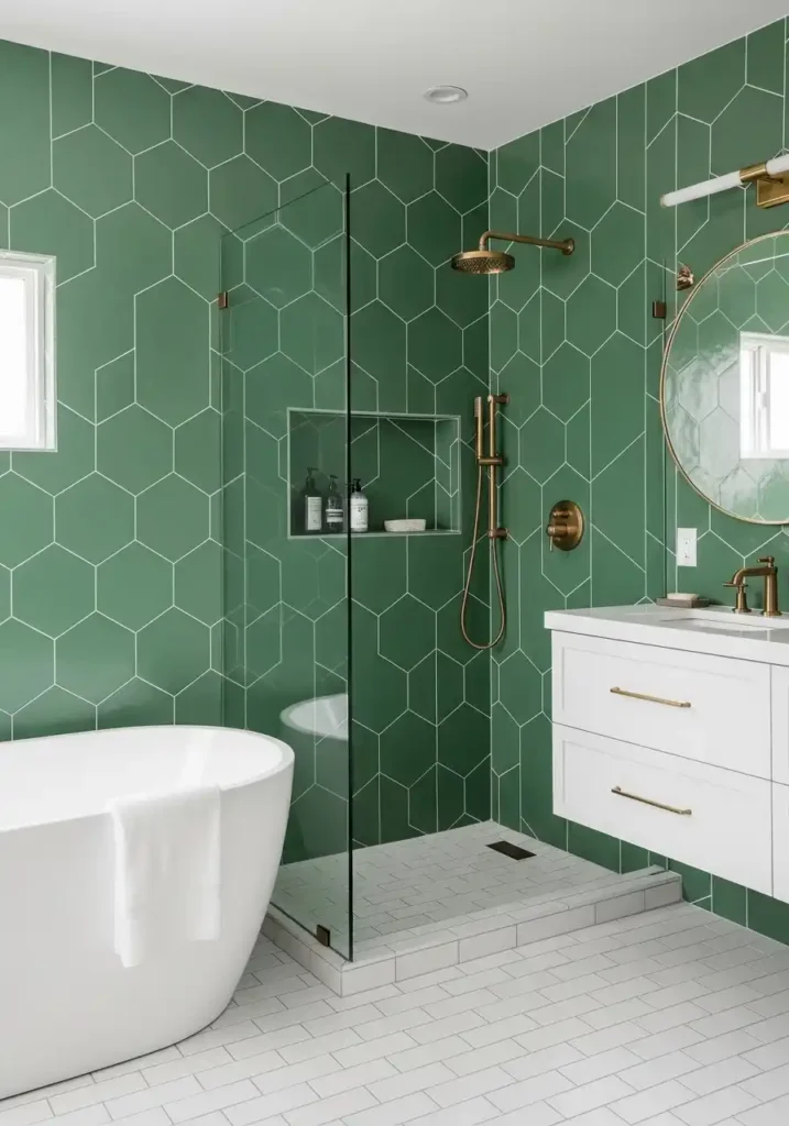 Green geometric tile bathrooms represent the most boldly contemporary and graphically confident approach to bringing green into a bathroom space — creating interiors of genuine architectural energy and visual dynamism that feel completely current and design-forward while being grounded in the centuries-old tradition of geometric tile pattern-making that has enriched domestic architecture across virtually every culture on earth! Large-scale hexagonal tiles in deep sage or forest green with their graphic six-sided geometry create shower walls and bathroom surfaces of extraordinary visual presence and confident contemporary beauty.