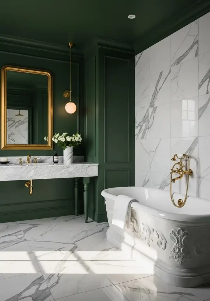 Green bathroom design paired with white or cream marble creates a combination of botanical and geological beauty that feels genuinely timeless and opulently luxurious — the deep, living quality of rich green walls or tiles providing the perfect dramatic backdrop against which the extraordinary natural patterning and veining of fine marble can perform at its most spectacular and most precious! The contrast between the organic warmth of green and the geological complexity of marble creates a visual richness that feels like the bathroom equivalent of a beautifully curated art exhibition — every surface rewarding sustained attention with new details and depth.