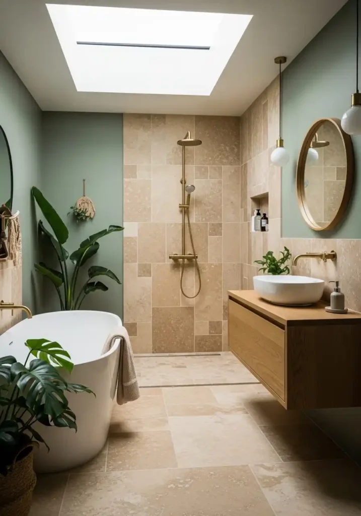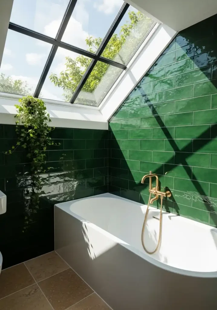 A green bathroom with a skylight is the most magnificent and genuinely transformative bathroom design combination imaginable — because natural light falling directly onto green surfaces from above creates a quality of illumination and color that is simply not replicable by any artificial lighting system at any level of sophistication or investment, a light quality that makes deep green tiles glow with a richness and depth that is nothing short of extraordinary and makes the simple act of bathing in natural light beneath a sky opening feel like one of the most genuinely luxurious and profoundly restorative experiences a home can offer!