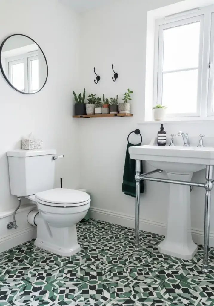 The design rule for a bathroom with a spectacular patterned green tile floor is to let the floor be the undisputed star and keep every other element around it clean, simple, and deliberately supporting rather than competing for attention! White walls, white pedestal sink, simple white toilet, and thin-framed black mirror create the clean, bright backdrop against which a dramatic green patterned floor can perform at its most spectacular and joyful. Black towel hooks and bathroom accessories echo the black in the tile pattern with design consistency and graphic clarity. Small plants on floating shelves add living greenery that echoes the floor’s color in a softer, more organic register without overwhelming the floor’s visual dominance.