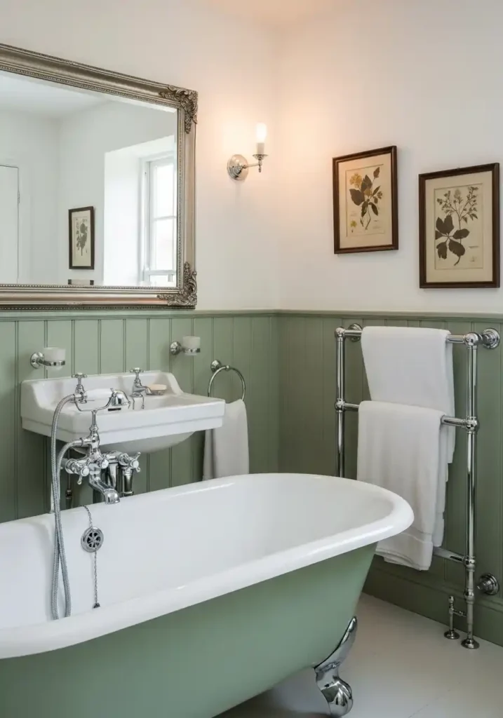 A vintage-inspired green bathroom is the design approach for homeowners who believe that the bathrooms of the past — with their generous proportions, their honest materials, their beautiful handcrafted fixtures, and their complete absence of hurry or compromise — understood something about the art of bathing and daily personal ritual that contemporary minimalist design sometimes forgets in its admirable pursuit of clean lines and visual simplicity! Sage green beadboard paneling to dado height, classic white painted walls above, and a magnificent clawfoot bathtub create a bathroom that feels like a lovingly preserved memory of a more gracious and unhurried domestic life.