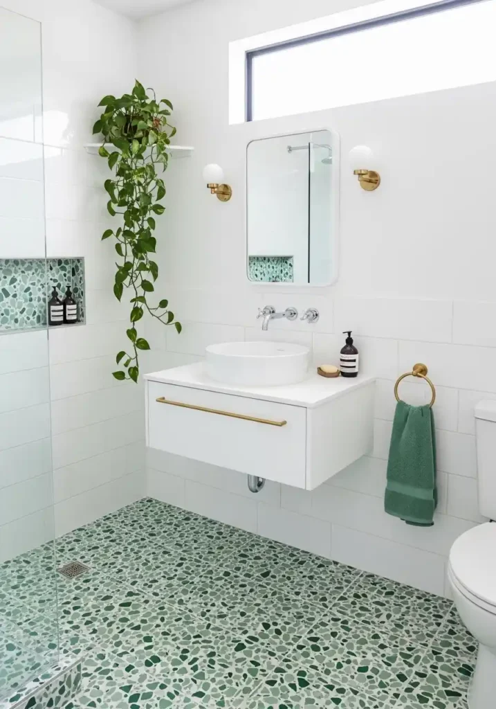The design approach to a green terrazzo bathroom requires the most careful balance between celebrating the terrazzo’s considerable visual complexity and ensuring the rest of the bathroom provides sufficient visual breathing room for the pattern to perform at its most beautiful without competition. White wall tiles, white sanitaryware, and simple chrome or brass fixtures create the clean, bright backdrop against which green terrazzo looks its most spectacular and joyful. A single dramatic terrazzo element — floor only, or shower niche shelving as an accent — suits bathrooms that want the beauty of the material without full pattern immersion. Full terrazzo floors, walls, and shower surround creates a bathroom of extraordinary, immersive pattern richness for the most boldly design-confident homeowners.