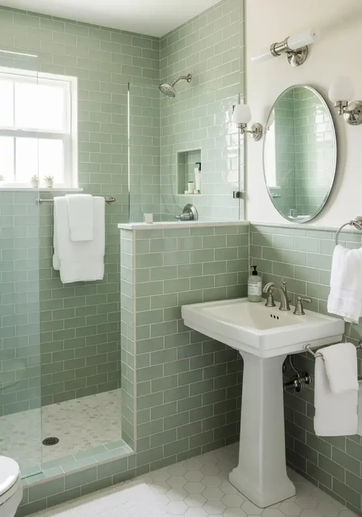 Sage green subway tiles bring together two of the most enduringly beloved elements in bathroom design — the clean, honest geometry of classic subway tile and the calming, nature-inspired beauty of sage green — to create a combination that feels simultaneously completely current and timelessly classic in a way that very few design choices can honestly claim! Handmade sage green ceramic subway tiles with their subtle surface variation and slightly irregular edges catch light differently across the tile field, creating a living, breathing quality that machine-perfect tiles simply cannot deliver, and making the bathroom feel genuinely crafted rather than simply installed.