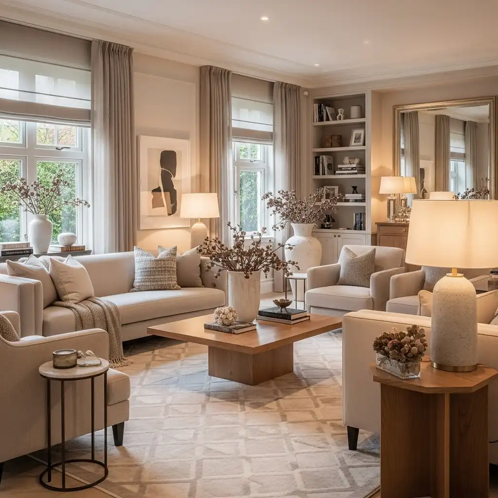 To elevate the look, mix different textures like velvet, silk, and wood. Subtle metallic accents and statement lighting add depth without overpowering the space. Neutral interiors remain versatile, allowing easy updates with seasonal decor or accent colors.
