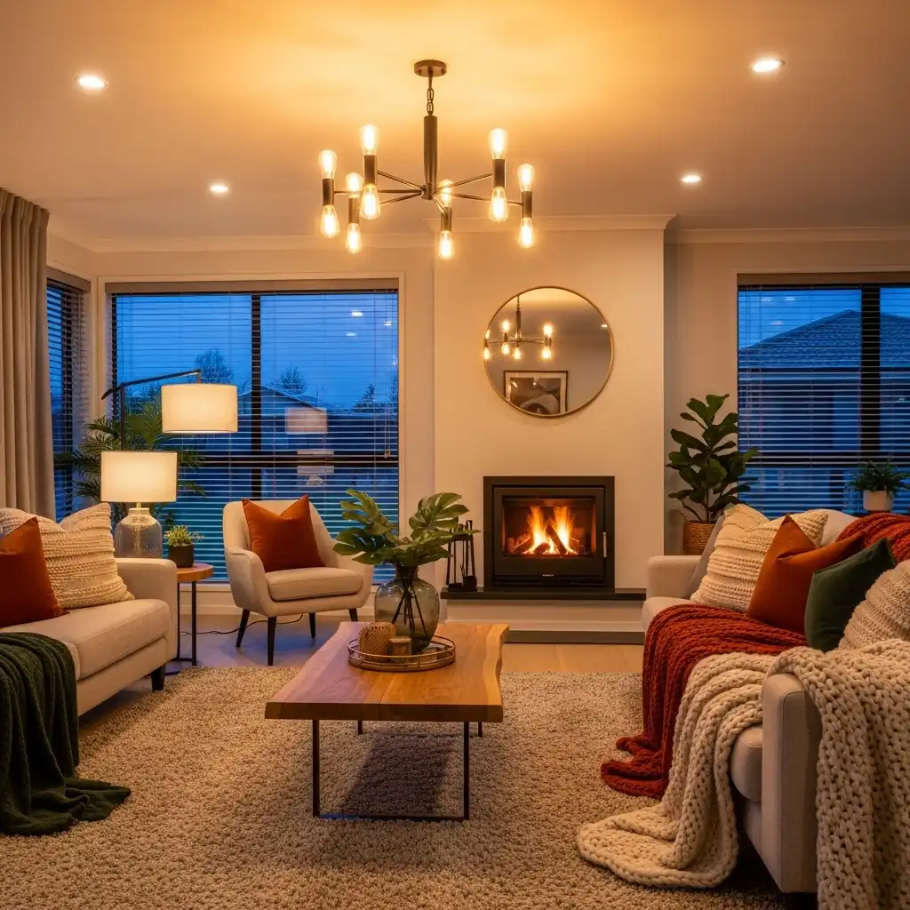 Warm lighting creates a cozy and inviting home atmosphere. Layered lighting using lamps and fixtures adds depth and comfort. This design idea enhances mood and functionality.