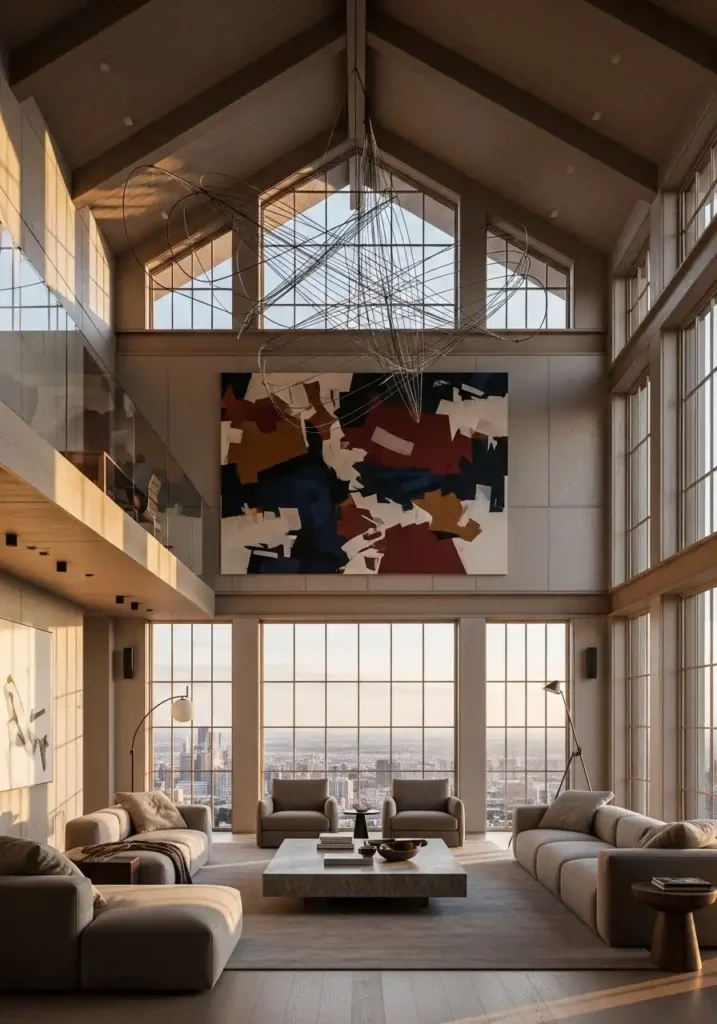 Furnishing and styling a double-height living room requires a completely different design approach than working with conventional spaces — and getting it wrong is very easy indeed. The key principle is scale: everything must be large enough to hold its own against the volume of the room. An oversized statement pendant light — perhaps a sculptural cluster of hand-blown glass globes or a dramatic custom installation — hanging from the apex of the ceiling claims the vertical space with confidence. Large-scale abstract art spanning the full two-story wall height transforms it into a gallery of the most impressive kind. Modular sectional seating in a conversational grouping creates an intimate human-scaled zone within the grandeur.