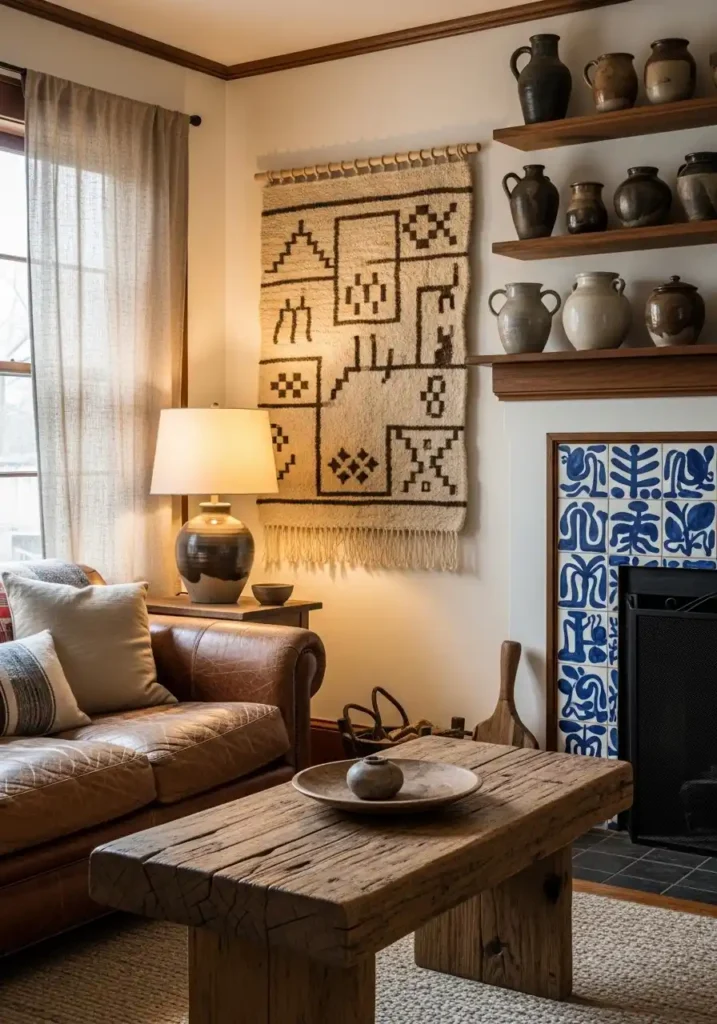 Building an artisan living room is both a design project and a collecting practice that rewards patience, curiosity, and a willingness to seek out makers who are doing genuinely exceptional work. Start with the pieces that have the most visual presence: a large hand-woven wall tapestry in natural undyed wool brings texture and craft to the biggest surface in the room immediately. A hand-carved wooden coffee table with beautifully visible tool marks becomes a conversation piece that every single guest wants to run their hands across. A collection of hand-thrown ceramic vessels in complementary earth tones on your shelves creates a still-life of extraordinary beauty. Choose rough linen curtains with an irregular weave, a hand-stitched leather sofa, and handmade tile for your fireplace surround. The cumulative effect is a room that feels like it was made specifically for you — because in the most meaningful sense, it genuinely was.