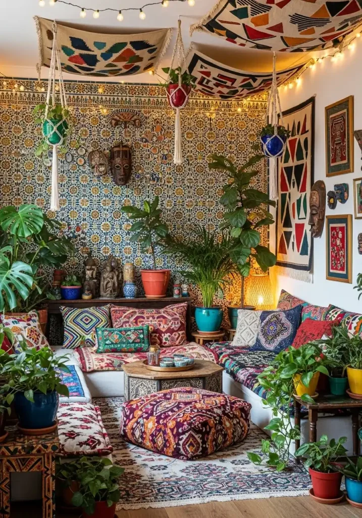 The brilliant thing about bohemian design is that there are genuinely no wrong answers as long as you approach the room with authentic joy and intentional layering. Start with your largest statement piece — perhaps a Moroccan-inspired tile accent wall, a massive hand-woven wall tapestry, or a collection of hanging macramé at varying heights. Then layer your seating low to the ground with a mix of floor cushions, poufs, and a low-slung sofa in rich jewel tones. Add plants — lots and lots of plants — in mismatched ceramic pots of every color and size. String lights overhead, globally collected art objects on every surface, and woven textiles in every direction. Pure, unbridled, beautiful chaos.