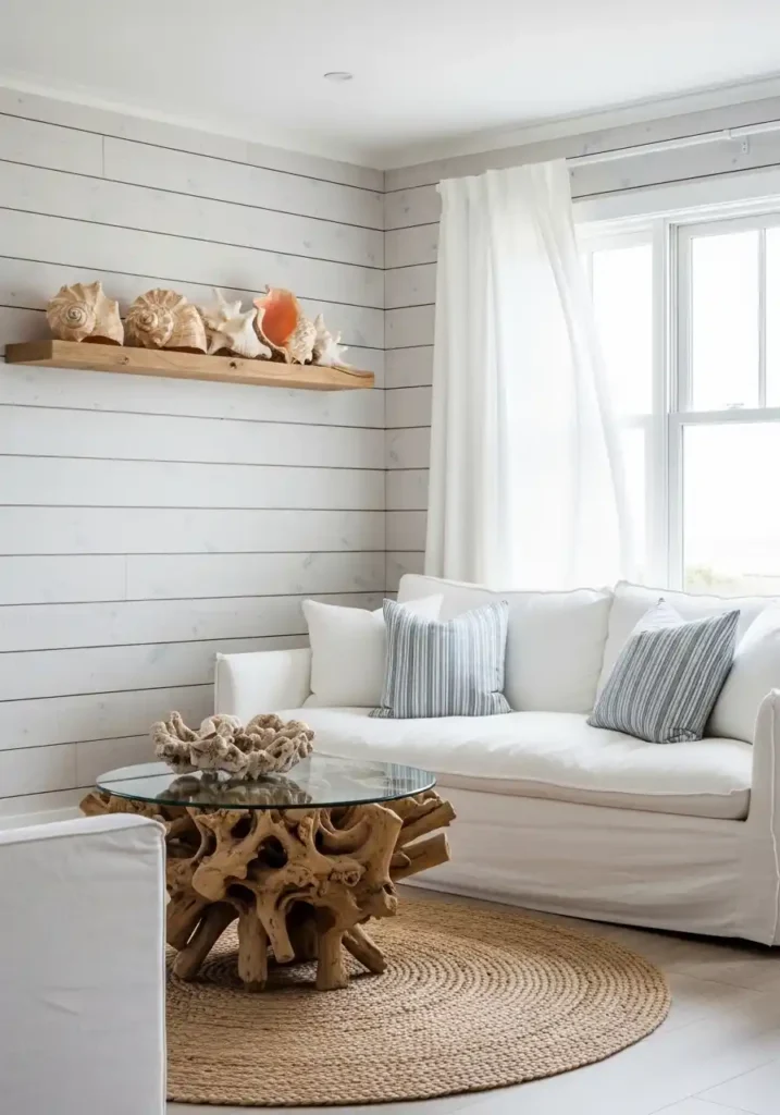 5. Coastal Living Room with Whitewashed Walls and Driftwood
