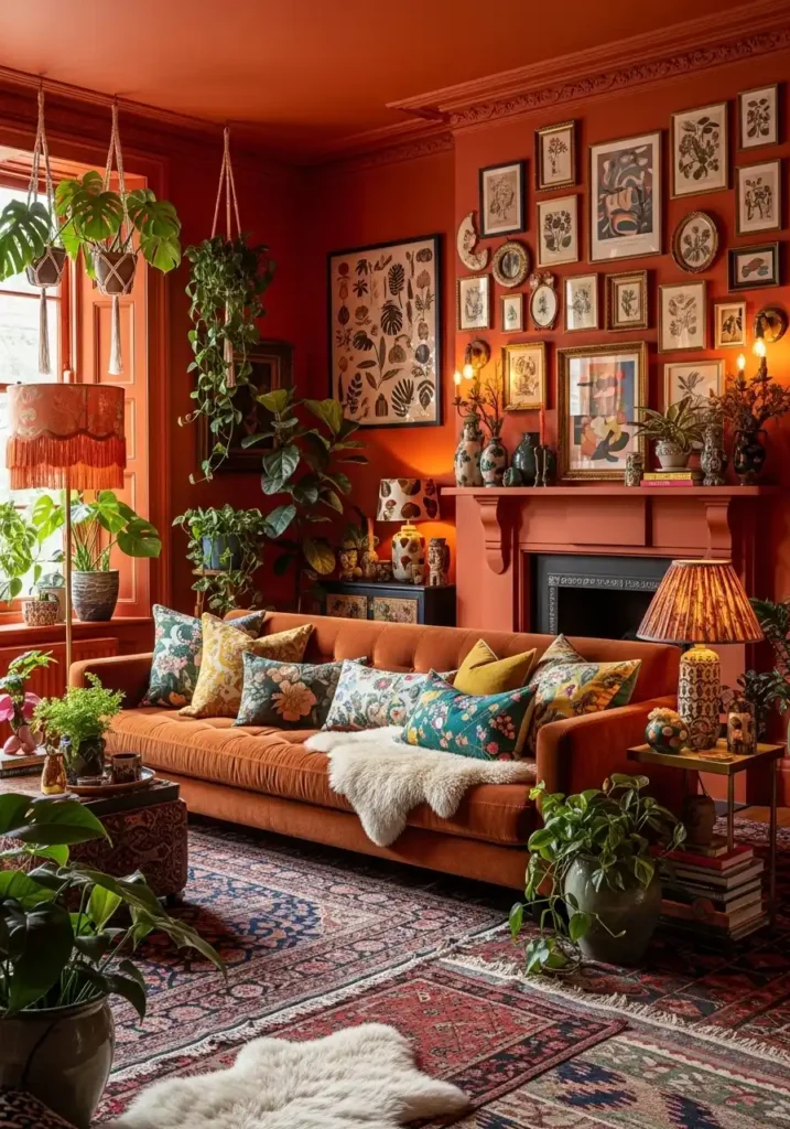 20. Color-Drenched Maximalist Living Room in Burnt Orange