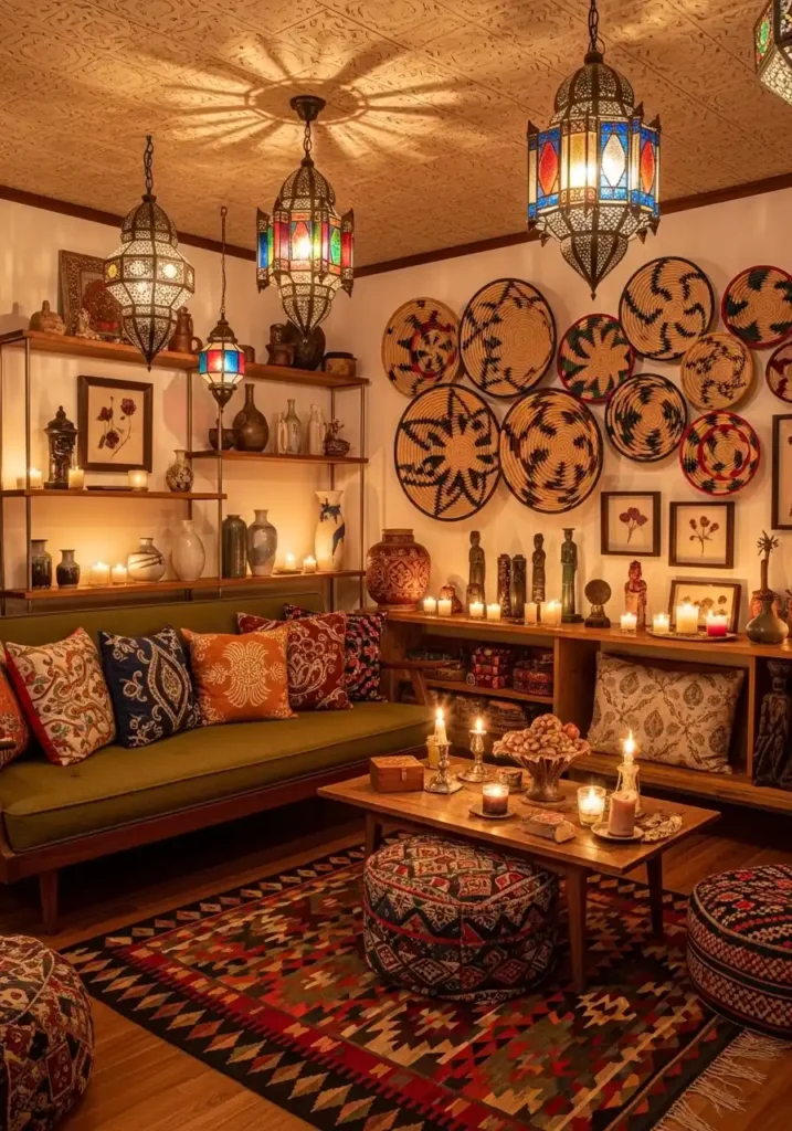 Curating an eclectic global living room is less about making design decisions and more about trusting your instincts, honoring your experiences, and giving every meaningful object you’ve collected a beautiful home. A Turkish kilim rug grounds the floor with rich geometric patterns and deep jewel tones. Moroccan lanterns hung at varying heights cast extraordinary star-shaped light patterns across the ceiling that change everything about the room after dark. Indian block print cushions, Japanese ceramic vessels, African woven baskets displayed as wall art, and a mid-century modern sofa that grounds everything with clean contemporary form — together, these elements create a room that is genuinely impossible to replicate and endlessly interesting to spend time in.