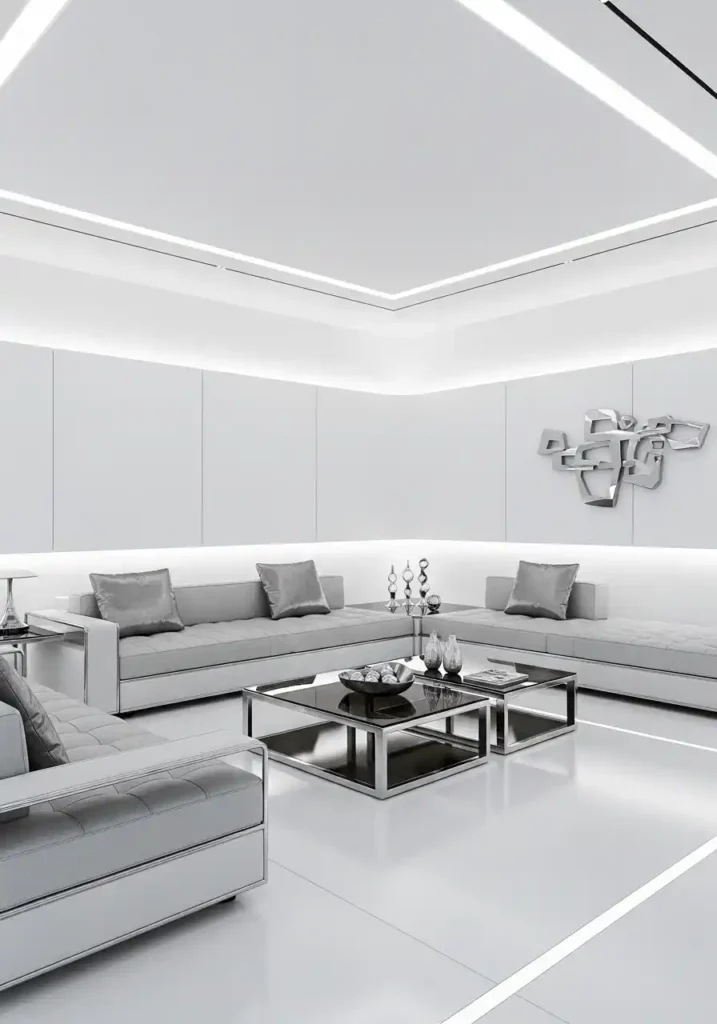 Building a futuristic living room begins with the radical act of removing everything that isn’t absolutely necessary to the room’s function and beauty — and then curating what remains with genuine precision. The walls and ceiling become a single continuous white surface interrupted only by the most precise architectural lighting: recessed LED strips that run along ceiling edges and floor planes, casting light in ways that seem to defy gravity. An ultra-low modular sofa in light gray with perfectly clean geometric lines sits close to the ground, emphasizing the horizontal and making the room feel wider and more spacious. Polished chrome, smoked glass, and brushed stainless steel as material accents add the cool metallic intelligence that makes this aesthetic so thrillingly distinctive.