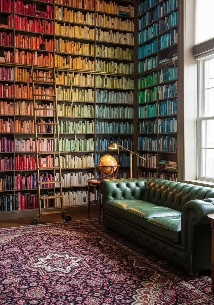 Designing a library living room that earns the title is a project of wonderful ambition and deeply satisfying execution. The bookshelves must be built-in — freestanding units simply don’t create the same enveloping architectural presence that fills a room with the feeling of being held by knowledge and stories on every side. Paint the shelves in a deep, moody color — forest green, deep navy, or charcoal — to create maximum contrast with the spines of your books and turn them into a collection that reads as art. A rolling brass library ladder is both functionally essential and spectacularly stylish. A deep tufted leather sofa in hunter green or burgundy anchors the room with the gravitas it deserves. This is where your best thinking happens.