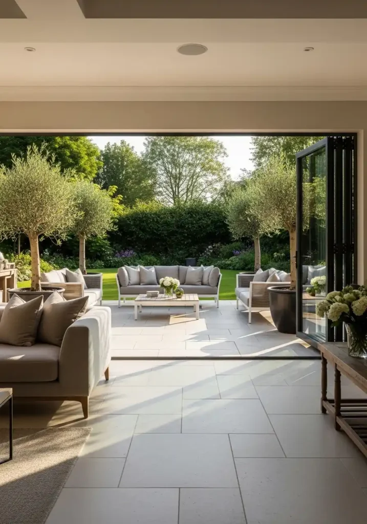 Creating a successful indoor-outdoor living room is fundamentally about eliminating the visual and physical barriers between the two spaces. Large bi-fold or sliding glass doors that fully disappear when open are the single most transformative architectural investment you can make in a home with outdoor potential. Carrying the same flooring material — large-format stone tiles, concrete, or wide-plank hardwood treated for both environments — from inside to outside creates a visual continuity that makes the combined space feel seamlessly intentional. Choose indoor furniture and outdoor furniture in the same tonal palette so the eye travels naturally between both zones. Frame the opening with potted olive trees or tall architectural plants to create a sense of arriving somewhere beautiful every time you step through.