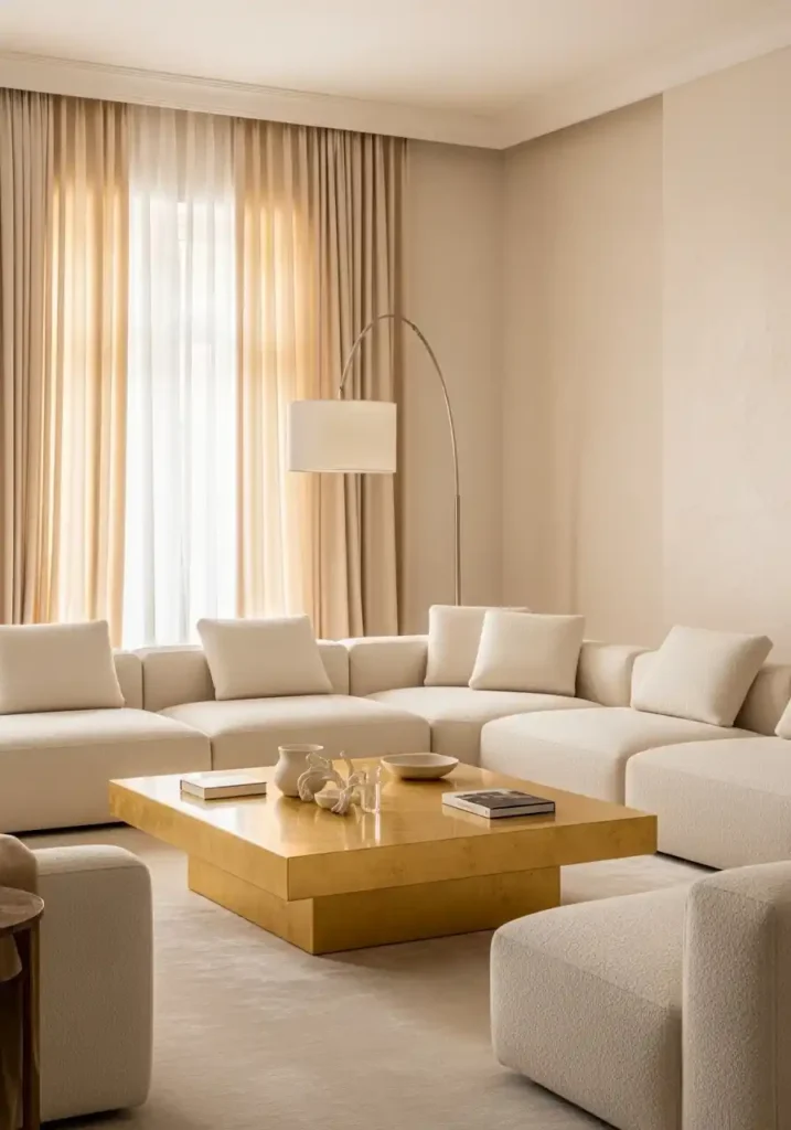 The architecture of this room is built on layers of tone and texture all living harmoniously within the same warm neutral family. Your oversized sectional — the emotional and visual heart of the room — should be upholstered in a fabric with genuine tactile luxury: cashmere, mohair, thick boucle, or a heavyweight linen in the warmest ivory you can find. Cream silk curtains pooling generously on the floor add drama and movement while reinforcing the palette. A gold travertine or brushed brass coffee table introduces a warm metallic shimmer that catches the light throughout the day. Textured plaster walls in warm off-white and a thick natural fiber rug underfoot complete a room that feels like the pinnacle of effortless, understated luxury.