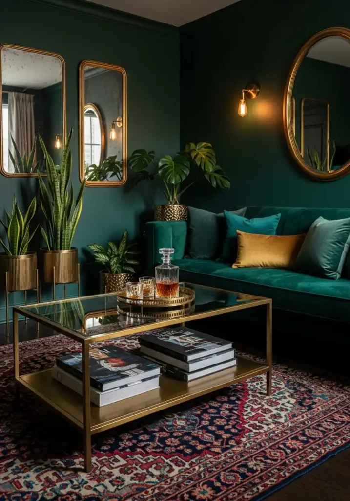 The magic of an emerald green living room truly unfolds in the layering. Start with those deep green walls as your foundation, then add a plush emerald velvet sofa that blends beautifully into the wall color while adding incredible tactile richness. A brass and glass coffee table introduces the warm gold tones that make the green sing. Antique gold-framed mirrors amplify light while adding a glamorous vintage edge. A richly patterned Persian rug in jewel tones anchors everything on the floor, and warm Edison-bulb sconces on the walls cast the whole room in the most gorgeous amber glow. Pure, unapologetic perfection.