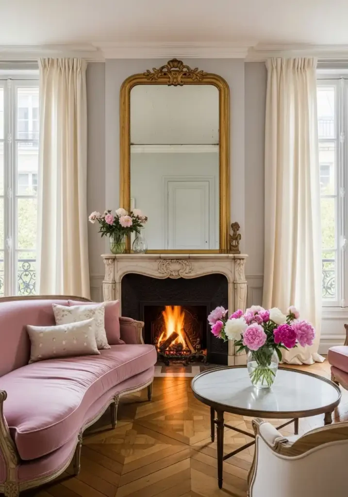 To bring that elusive Parisian quality into your living room, start with the architectural details that Haussmann-era apartments are famous for: tall windows dressed in floor-to-ceiling ivory silk curtains, an antique fireplace mantel as the room’s undisputed focal point, and herringbone parquet floors that ground everything with historical elegance and warmth. A curved sofa in dusty rose or pale sage velvet introduces softness and French femininity, while a gilded baroque mirror above the mantel adds the kind of glamorous vintage drama that only real antiques can deliver. Fresh peonies, a stack of beautiful coffee table books, and a worn Persian rug complete the look. C’est parfait.