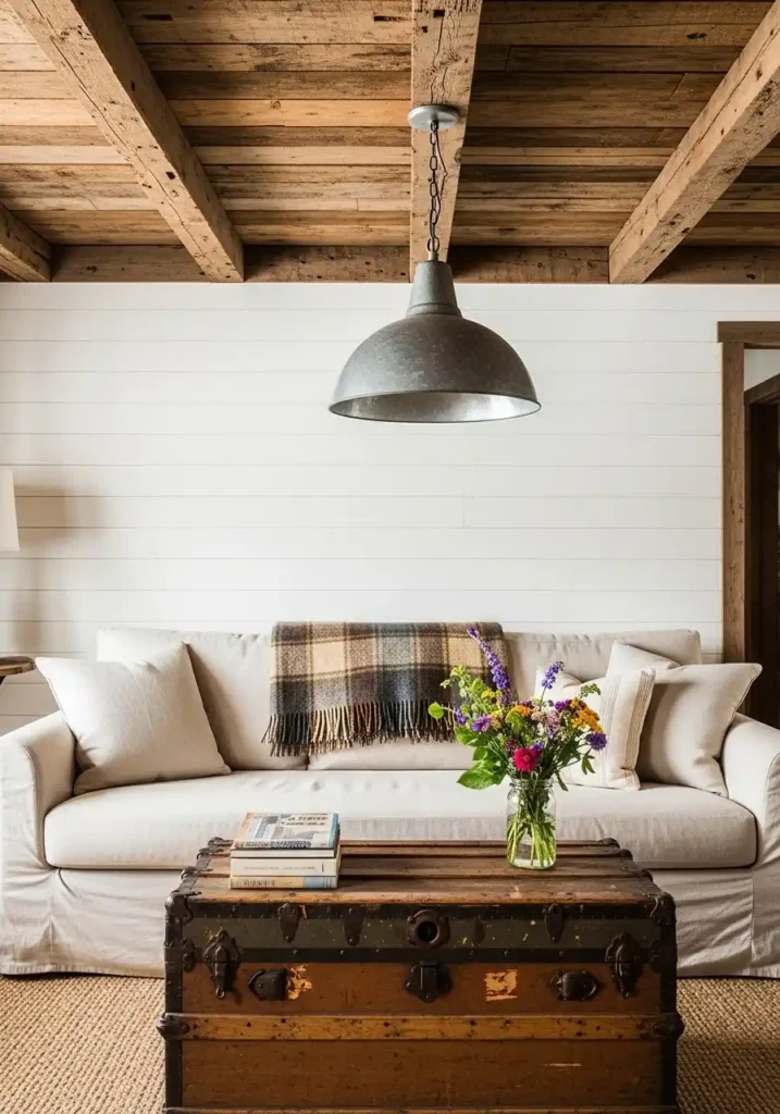 Creating a farmhouse living room that feels authentically warm rather than theme-park rustic is all about using real, honest materials that have genuine character and history. Exposed reclaimed wood ceiling beams with visible grain and age marks immediately transform a room’s entire atmosphere, adding architectural drama and warmth that no other single element can replicate. A shiplap accent wall behind the sofa reinforces the farmhouse aesthetic without overwhelming the room with wood. Slipcover your sofa in washed natural linen — it’s the most forgiving, most beautiful upholstery fabric for a home that actually gets lived in. An antique wooden trunk as a coffee table, wildflowers in mason jars, and a handmade wool throw complete the picture perfectly.
