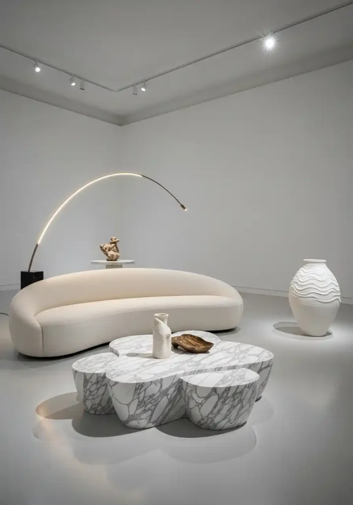 Designing a sculptural living room requires the same curatorial eye as designing a gallery show — each piece must earn its place through the quality and distinctiveness of its form. An organically curved cream sofa in sculptural boucle serves as the room’s centrepiece, its flowing silhouette beautiful from every possible angle. A freeform coffee table in veined travertine or marble brings geological artistry to the floor plane. An oversized arc floor lamp with a dramatically curved neck draws the eye upward and adds architectural poetry to the vertical space. White gallery walls and precise museum-quality spotlighting ensure each piece is seen, appreciated, and celebrated exactly as it deserves to be.