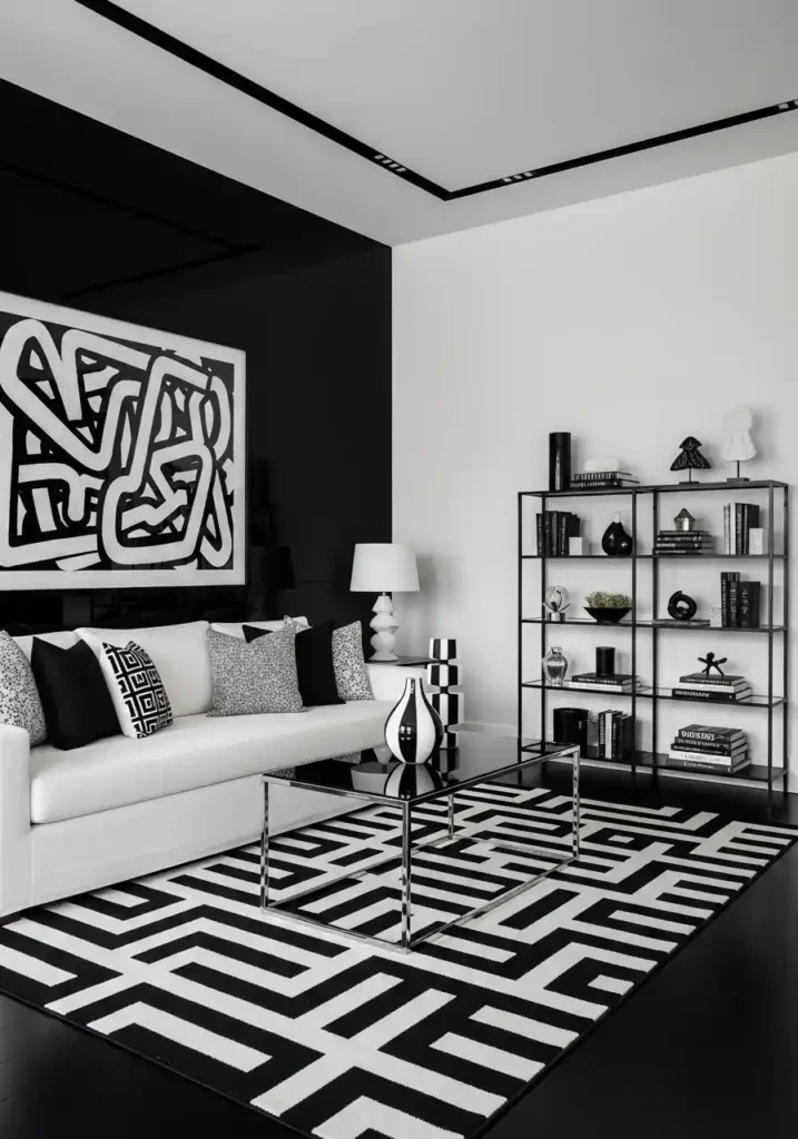The key to a black and white living room that feels exciting rather than cold is texture and the confident mixing of pattern scales. A large-scale geometric black and white area rug grounds the room with bold graphic energy, while a white linen sofa piled with textured cushions brings warmth and tactile softness to the palette. A single black lacquered feature wall behind the sofa creates dramatic depth and makes the white elements in the room pop with incredible brilliance. Oversized black-framed abstract art, chrome and glass occasional tables, and black metal shelving complete the look with an architectural precision that is genuinely thrilling to live inside.